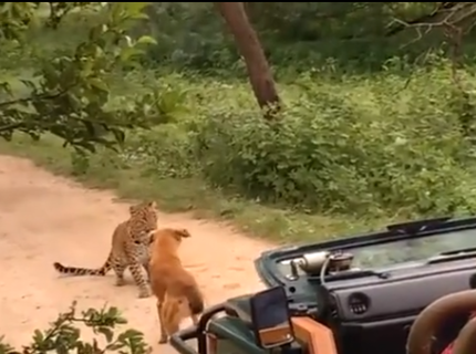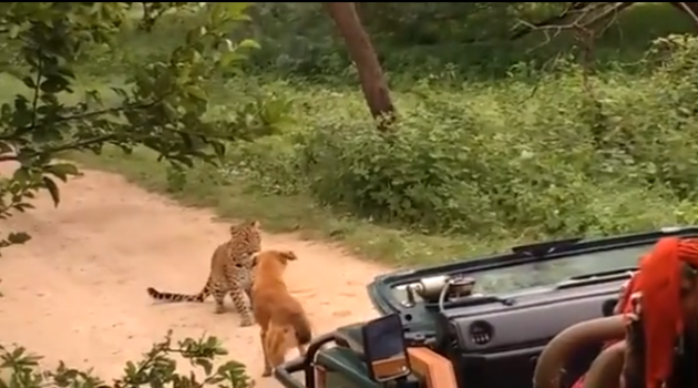 Пёс дал отпор прыгнувшему на него леопарду