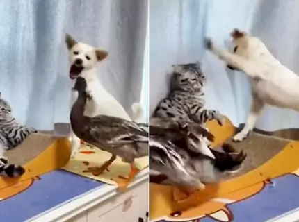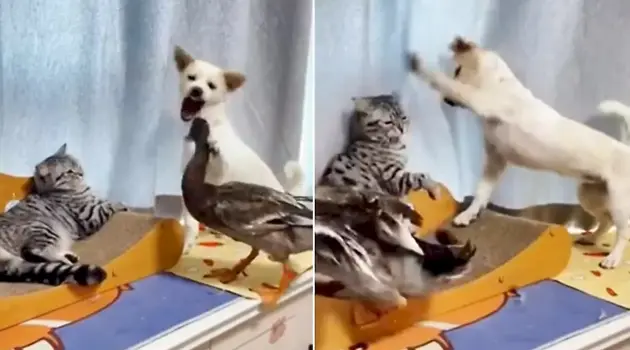 Кошка, щенок и утка устроили потасовку на глазах у владельца
