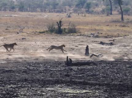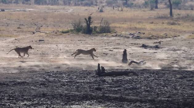 Бородавочники сбежали от нерасторопных львиц и попали на видео