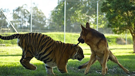В зоопарке австралийского штата Новый Южный Уэльс суматранский тигр по кличке Кинва подружился с немецкой овчаркой Рамблом. Об этом пишет Daily Mail. Семилетний Кинва вырос в зоосаду и с рождения играет и отдыхает вместе с Рамблом, который обитает в том же парке. Отмечается, что в зоопарке работает хозяйка пса. Сотрудники парка публикуют на странице учреждения в социальной сети Facebook видео, на которых животные играют друг с другом. Последний ролик, загруженный 23 июня, просмотрели более 50 тысяч раз за пять дней. Ранее в июне бывшая пресс-секретарь Приморского сафари-парка Евгения Патановская заявила, что это она предложила сделать медийную историю из совместного проживания тигра Амура и козла Тимура. По ее словам, хищник не стал есть травоядное только потому, что был накормлен заранее. О том, что тигр и козел, которого привели на съедение хищнику, подружились, сообщалось в конце ноября 2015 года.