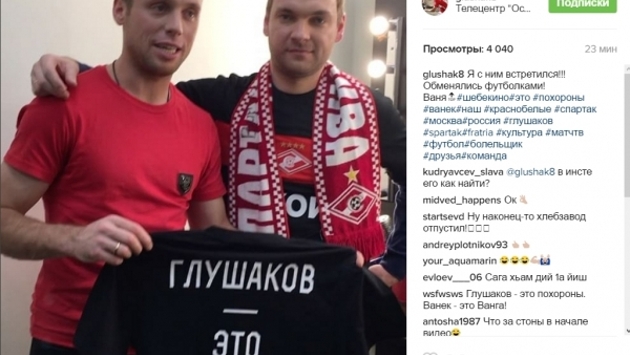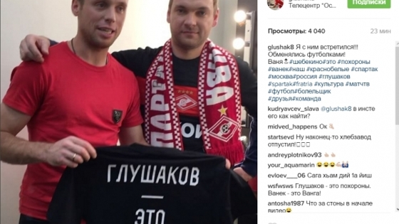 Полузащитник «Спартака» Денис Глушаков рассказал о своём отношении к ставшему популярным мему «Глушаков – это похороны». Фраза была сказана болельщиком по имени Иван в преддверии матча РФПЛ «Спартак» — ЦСКА (3:1). Глушаков тогда выложил видео со словами болельщика в своём «инстаграме». Позже Глушаков встретился с болельщиком, и они обменялись футболками: на видео футболист стоит с футболкой в руках, на которой написано «Глушаков — это похороны». «Нормально отношусь к этому мему, уже привык. Присылают мемы в „Инстаграме“, что Глушаков — это похороны, предлагают разрекламировать — то телефоны делают, то чехлы, то футболки. Но мне только Ванька и подарил эту чёрную футболку. Я ему подарил игровую футболку, а он мне – вот эту, „Глушаков — это похороны“. Но я её, если честно боюсь. Наверное, кому-нибудь передарю, поскольку я суеверный человек», — признался Глушаков в эфире программы «Все на матч».