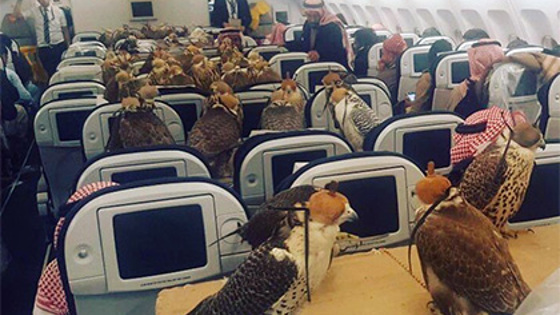 Пользователь Reddit с ником lensoo опубликовал фотографию, на которой запечатлены десятки соколов, путешествующих в салоне обычного пассажирского самолета. Об этом сообщает издание Mashable. Снимок сделал командир экипажа самолета. Автор поста утверждает, что авиабилеты для 80 охотничьих птиц купил саудовский принц. Соколы занимают большинство кресел в среднем ряду. Чтобы они не беспокоились, их глаза прикрыты надетыми на голову клобуками. Другие пользователи Reddit объяснили lensoo, что это не такая уж редкость на ближневосточных рейсах. Например, сайт катарской авиакомпании Quatar Airways предупреждает, что пассажиры могут взять в салон эконом-класса до шести соколов. 16 января сообщалось, что пакистанские крестьяне, вооруженные ножами и ружьями, напали на катарского принца, который устроил соколиную охоту на дрофу-красотку — редкую птицу, мясо которой очень ценится в арабских странах. Три охранника получили ранения.
