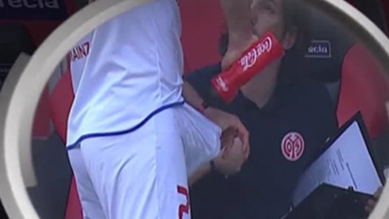 . 27-летний футболист решил освежиться во время тренерской установки на скамейке запасных в перерыве встречи 26-го тура чемпионата Германии с «Ингольштадтом». После этого он вышел на поле и отыграл второй тайм. «Майнц» потерпел поражение со счетом 1:2.