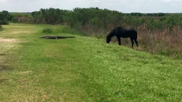 На кадрах видно, как аллигатор длиной более метра лежит на дороге, возле которой паслись лошади. Вскоре одна из них подскочила к хищнику и несколько раз лягнула его копытами. В ответ на это он попытался укусить животное за ногу. Лошадь отбежала в кусты на обочине, а рептилия уползла на другую сторону дороги. Туристка утверждает, что ни лошадь, ни аллигатор, скорее всего, не получили серьезных ранений. «Когда мы уходили, не было явных признаков боли или кровотечения», — написала она в посте, который собрал более 570 тысяч просмотров. 5 апреля сообщалось, что в штате Флорида самка аллигатора вывела детенышей на одно из местных полей для гольфа.
