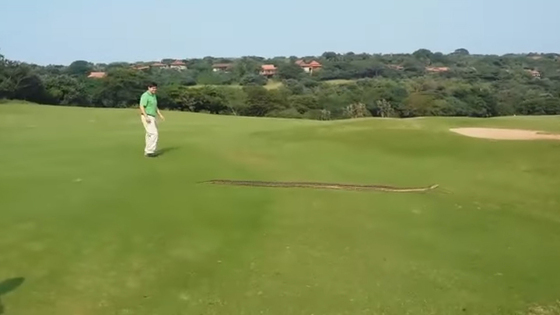 В ЮАР на поле для гольфа прямо во время игры выполз четырехметровый питон. Рептилию заметили в районе восьмой лунки в гольф-клубе "Зимбали" в провинции Квазулу-Натал на восточном побережье страны. Не обращая никакого внимания на игроков, питон начал пересекать поле по траве, сообщает Daily Mail. Когда же один из гольфистов попытался потрогать рептилию за хвост, та отдернулась.
