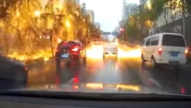Молния, которая попала в одну из самых оживленных улиц в китайском городе Шэньян, стала причиной возникновения огненного дождя. Видеорегистратор одной из машин снял уникальное и пугающее явление.