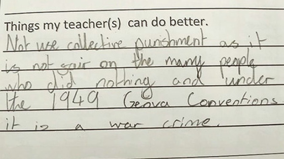 На форме обратной связи в графе «Что бы учителя могли делать лучше» 11-летняя девочка написала: «Не использовать принцип коллективного наказания. Он нечестный по отношению ко многим людям, которые ничего не сделали. Кроме того, исходя из положений Женевской конвенции 1949 года, это военное преступление». «Вот думаю: наказать ее или мороженое купить», — поделился с пользователями соцсетей озадаченный отец девочки. Мэйсон Кросс пояснил в интервью BBC News, что учителя дочке нравятся, но система образования вызывает вопросы. На подозрения в том, что записку написал он сам, Кросс ответил: «Чувак, если бы я это придумал, то все-таки заставил бы ее исправить ошибку в слове "Женевская"». Отец все же решил не наказывать дочь и купить ей мороженое — хотя девочка, очевидно, не знала, что школа не является зоной боевых действий, ученики — комбатантами и нон-комбатантами, а учебное время — военным.