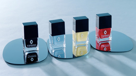 Компания Renault выпустила лак для ногтей, называющийся так же, как и одна и моделей марки – Twingo. Представители производителя утверждают, что им можно замазать и небольшие царапины или сколы на кузове. Лак выпускается в тех же цветах, которые предлагаются для кузова Renault Twingo: черный, желтый, красный и синий. Одна баночка лака стоит 8,90 евро. Купить его можно в онлайн-магазине компании. Лак для «Рено» производит парижский косметический стартап Ink and Out. Как уточняет Automotive News, во Франции организации по борьбе за права женщин уже обвинили «Рено» в сексизме.