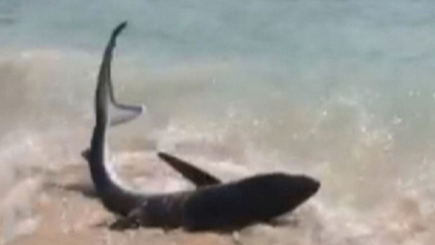 Акула, выбросившаяся на пляж на испанском острове Майорка, спровоцировала панику среди отдыхающих. Видео случившегося опубликовал телеканал