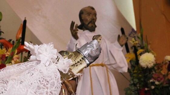 Мэр маленького рыбацкого городка в Мексике сыграл свадьбу с крокодилом, но все это ради общего блага, передает телеканал «МИР 24». Дело в том, что в тех местах верят, что хищная рептилия - это заколдованная принцесса, и свадьба с ней принесет хороший урожай и большой улов. На церемонию пришел весь город, играла музыка и пел хор. На невесту надели фату и свадебное платье, а также перевязали пасть розовой ленточкой. О странных свадьбах читайте в материале «МИР 24» «С пиццей и iPhone под венец, или Безумные-безумные свадьбы».