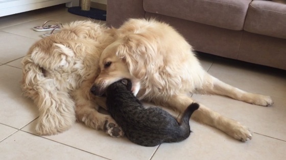 Живущий в Израиле владелец золотистого ретривера Ская и котёнка Эвклида заснял общение животных. Громадный пёс попытался проглотить годовалого друга, но потом начал облизывать котёнка, словно прося прощения.
