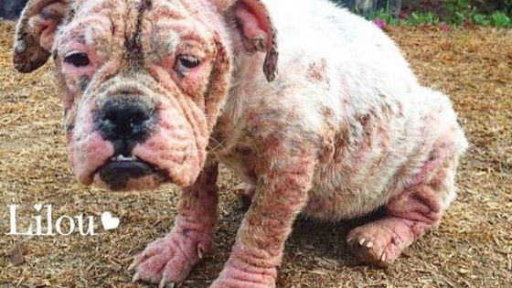 Собака страдала от серьезной формы чесотки. Все было настолько плохо, что все тельце бедняги покрыли струпья.