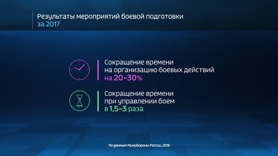 Russian military training. Thousands of exercises conducted: 2012 — 2,7 2017 — 8,1 Three times. Exercises conducted in 2017: joint exercise — 1235 two-side maneuvers — 1468 35 international exercises have been conducted. The results of the 2017 training: Time needed for the organization of military actions is reduced by 20-30% Time spent on engagement control reduced by a factor of 1.5-3. These results were achieved thanks to the new Unified tactical management system. The increase in the level of training compared to 2013: combat vehicles operating — by a factor of 1.2 skydiving — by a factor 1.5 aircraft crew experience — by a factor of 1.6 ship crew experience — by a factor of 1.5 submarine crew experience — by a factor of 2.8