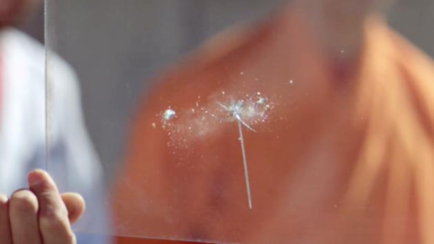 Чтобы точно увидеть происходящее в момент броска, эксперимент повторили уже без воздушного шарика. Скорость полета иглы настолько высока, что первая трещина будто возникает в стекле моментально.