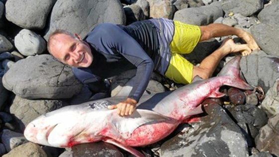 Австралийцу удалось справиться с акулой и вытащить ее на берег. На фотографии, сделанной после инцидента, он позирует на каменистом пляже рядом с мертвой рыбой, длина которой сопоставима с ростом взрослого человека.