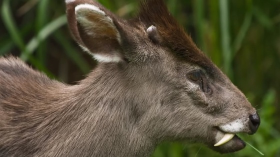 1. Хохлатый олень. Эти обитатели южного Китая имеют совсем маленькие рога, которые зачастую не видны из-за хохолка, и клыки, выступающие изо рта.