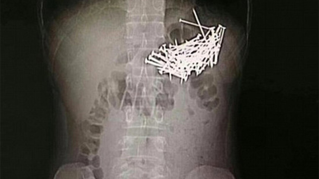 25-летний мужчина поступил в больницу с жалобами на боль в животе. Рентген показал десятки гвоздей длиной 4–5 сантиметров в его грудной клетке. Еще несколько гвоздей располагались в области таза.