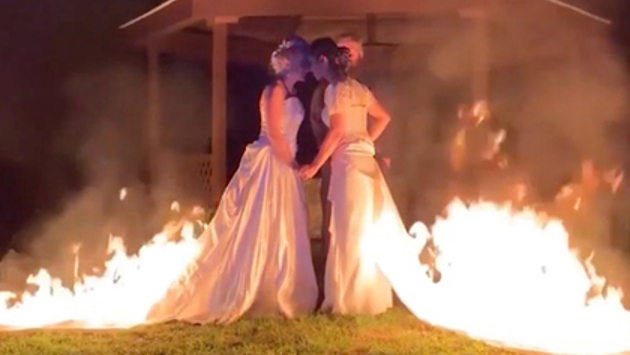 После заключения брака 32-летняя Эйприл Чой (April Choi) и 28-летняя Бетани Бирнз (Bethany Byrnes) взялись за руки, а друзья поднесли к ним факелы. Шлейфы запылали, затем огонь поднялся выше. После этого девушки сбросили и потушили горящие платья.