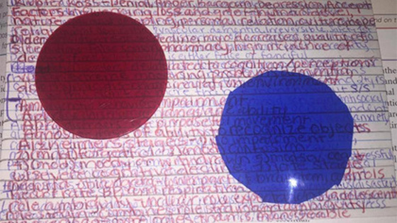 Шпаргалка содержала два слоя текста. Первый был написал синими чернилами, второй — красными. С помощью прозрачных пластиковых пластин синего и красного цвета ученик мог скрывать ненужные части текста.