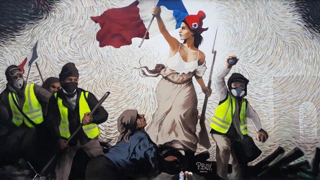 Вместо пролетариев XIX века, Паскаль разместил вокруг Свободы современных протестующих, которых в ноябре 2018 года назвали «желтыми жилетами» за их своеобразную экипировку.