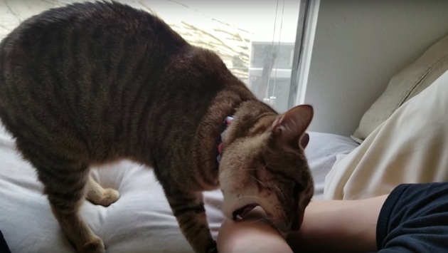 Кот начал выбирать тактику нападения – он набросился на хозяина и принялся кусать его руку. Если мужчина прекращал петь, то кот успокаивался.