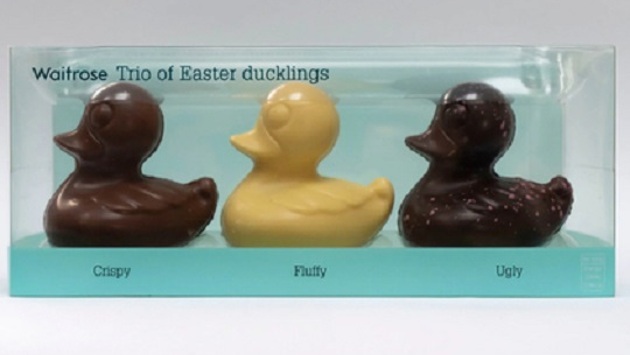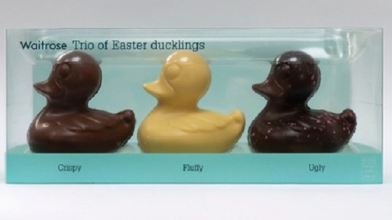 В коробке конфет стоимостью восемь фунтов стерлингов (677 рублей) лежали три сладкие утки. Изделия из белого, молочного и темного шоколада были подписаны «Пушистый», «Хрустящий» и «Гадкий». Особое внимание посетителей магазина привлекла утка из темного шоколада с подписью «Гадкий». Клиенты обвинили производителя в расизме.