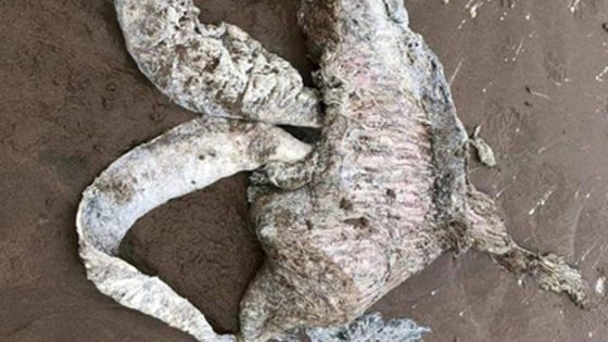 28 сентября Ричард Уолден (Richard Walden) гулял по пляжу и наткнулся на необычное существо. Он опубликовал фотографии находки в Facebook-группе A Place in North Devon с вопросом: «У вас есть мысли, что это за зверь такой? Думаю, если его растянуть, он будет около трех метров в длину. Наверно, это кальмар или осьминог».