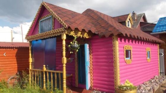 Площадь участка — девять соток, двухэтажного дома — 95 квадратных метров. Жилье выделяется авторским дизайном, включая причудливые интерьеры и экстерьеры. Фасад дома окрашен в сиреневый цвет и щедро декорирован всевозможной резьбой в золотых тонах.
