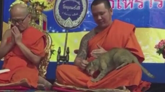 Так буддийский монах просто молился в одном из храмов Бангкока, сидя в традиционной "позе лотоса". Но каменное спокойствие монаха прервала кошка, которая никак не могла от него отойти. животное без конца отвлекало монаха, лезло на ручки, и пыталось привлечь к себе внимание.