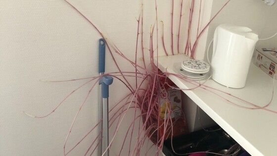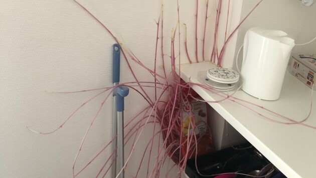 Оставленное в помещение растение даже повредило мебель. На изображениях видно, что представитель флоры смог пробиться сквозь клей, прикрепляющий полку к стене.