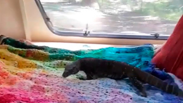 59-летняя Аманда Купер сняла на камеру, как огромная рептилия исследует ее жилище — на кадрах двухметровый варан лазит по постели женщины и обнюхивает ее вещи.