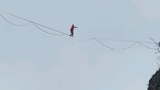 На кадрах видно, как неизвестный мужчина идет по веревке, натянутой между скал над дорогой. Отмечается, что эквилибриста заметили в районе сочинского экстрим-парка Skypark, неподалеку от села Казачий брод.