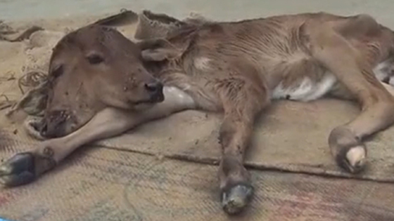 На записи виден лежащий на земле теленок, две головы которого смотрят в разные стороны. Вокруг животного стоят и сидят люди. Одна из женщин склонилась перед теленком в молитве. Другая жительница деревни кладет перед ним подношения и гладит его.