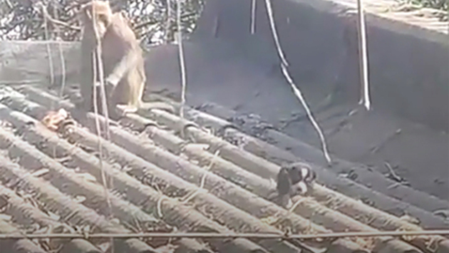 Макака утащила собаку на крышу сарая и несколько дней ухаживала за ней, кормила ее и следила, чтобы та не свалилась на землю.