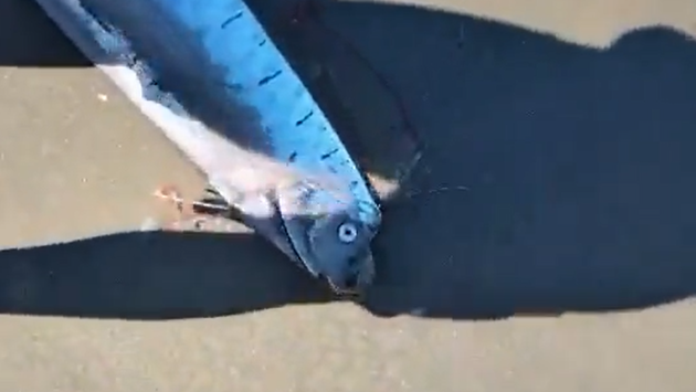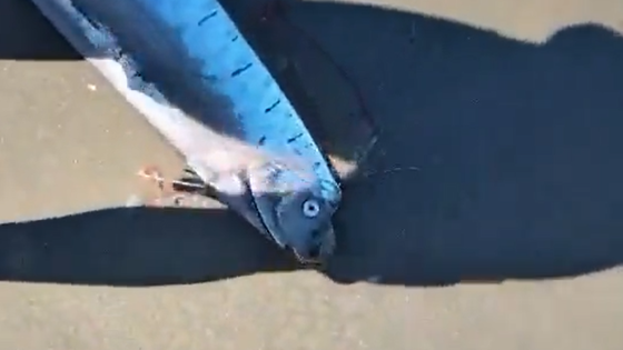 На берег океана выбросило рыбу-ремень — змееподобное морское существо, которое чаще всего обитает на больших глубинах. Биолог предположила, что сельдяного короля (именно такое название есть у этого вида) выбросило на берег, потому что он болен.