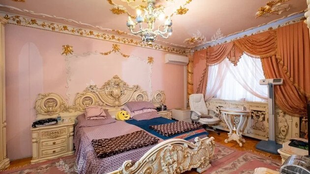 Видно, что сначала хозяин следовал плану создать архитектурный шедевр: роспись и лепнина на потолке, золоченые люстры, колоннада, имитирующая паркет плитка, резная мебель из массива в спальне. Но потом что-то пошло не так.