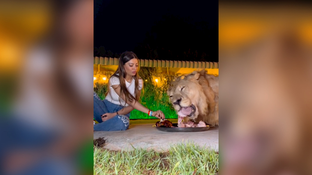 Женщину и хищника сняли на видео. На кадрах видно, как лев ест мясо, а посетительница лезет рукой в его тарелку и спокойно берет кусочек себе. Женщина ведет себя непринужденно и разговаривает с мужчиной за кадром.