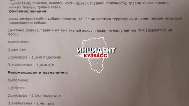 Женщина отвезла пострадавшую собаку к ветеринару в Новокузнецк. У животного диагностировали перелом лучевой кости, травмы глаза, клыка и мягких тканей. Владелица пса хочет добиться наказания для соседа.