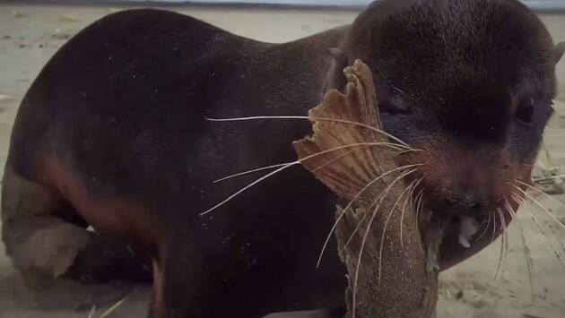 На кадрах видно, как животное лежит на песке, а затем берет в зубы тушку рыбы и несколько раз бьет ею камеру.