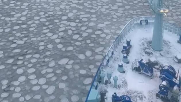 На кадрах видно, что поле льдин, имеющих форму блинчиков, занимает все пространство до горизонта. Льдины плавают в шуге — рыхлом льде, через которую атомоход проходит без какого-либо труда.