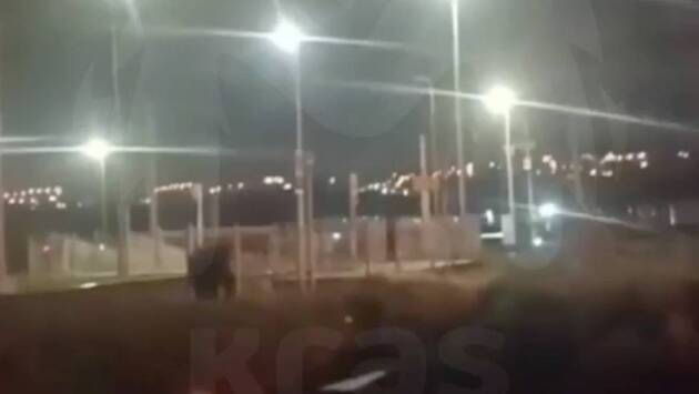 На кадрах видно, как дикий зверь бродит ночью по проезжей части, автор видео снимает его из автомобиля.