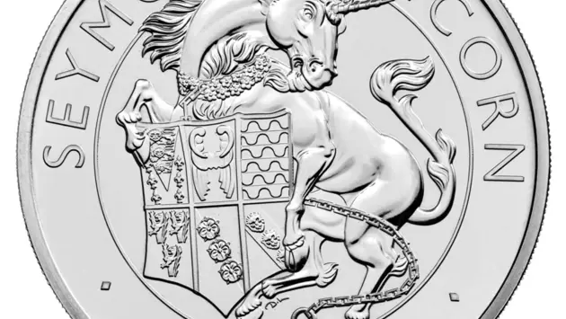 МД Великобритании представил очередные памятные монеты с еще одним геральдическим зверем дворца Хэмптон-Корт - единорогом Сеймур. В отличие от шотландского единорога на этом мифическом существе присутствуют королевская корона и венок из цветов. Единорог, подаренный Джейн Сеймур, символизирует плодородие и чистоту помыслов.