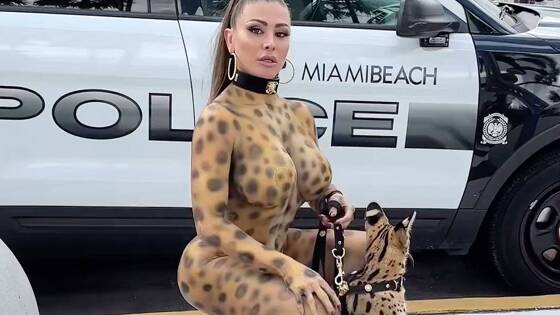 На размещенных кадрах манекенщица предстала с упомянутым животным породы саванна. При этом она продемонстрировала боди-арт, имитирующий золотистый с черными пятнами окрас шерсти питомца. Кроме того, блогерша надела V-образные стринги с заниженной талией, мюли на каблуках, массивные серьги-кольца и чокер и завязала волосы в высокий хвост.