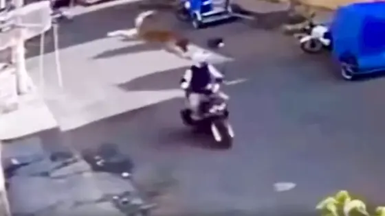 Пёс подкараулил мотоциклиста и в прыжке сбил его с байка: видео