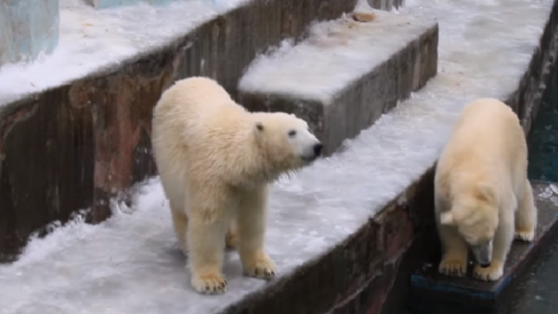 На записи видно, как одно из медвежат осторожно касается замерзших ступенек, а затем к нему присоединяется его сестра, которая становится рядом на лестнице.