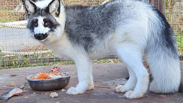 На кадрах запечатлен мраморный лис Амур — его шубка белого цвета, с черными и серыми вкраплениями и пятнами.