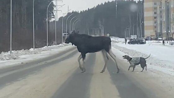 Неожиданно вслед за сохатым на дорогу выскакивает собака и принимается его облаивать. Она подбегает настолько близко, что оказывается у задних копыт. По всей видимости, ей хочется, чтобы лось в испуге ускорил ход или даже побежал, однако тот продолжает движение, не обращая никакого внимания на «моську».