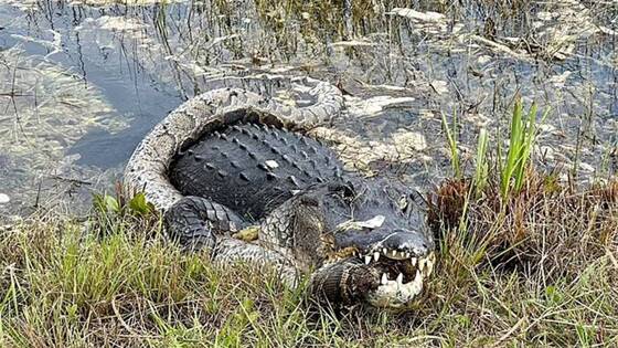 Элисон Джослин, атлетка, велосипедистка и фотограф-любитель, отправилась на велосипедную тренировку в Национальный парк Эверглейдс в штате Флорида. Там ей по счастливой случайности удалось снять финал невероятной схватки между питоном и гигантским трехметровым аллигатором, которые дрались в болоте. Когда Джослин оказалась рядом, аллигатор на ее глазах пожирал обмякшего питона, который по-прежнему обвивался вокруг его тела.
