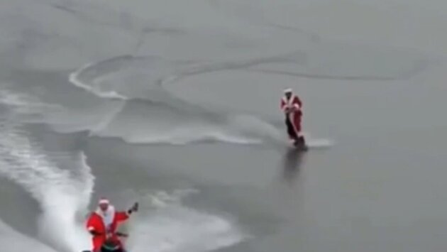 Двое молодых людей на гидрокостюмы надели красные халаты и шапки Деда Мороза (один даже нацепил бороду), прокатились по Суре на гидроцикле и вейкборде и сняли процесс.