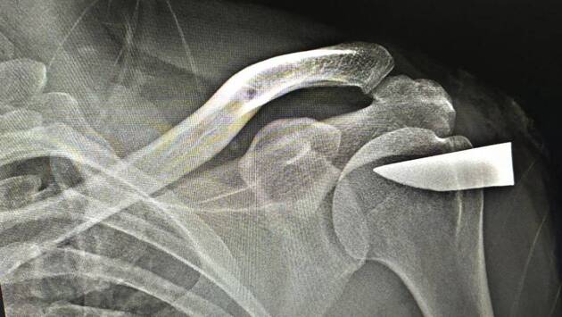 Результаты рентгена поразили врачей: причиной боли был шестисантиметровый осколок клинка. Посторонний предмет глубоко вошел в плечевую кость.